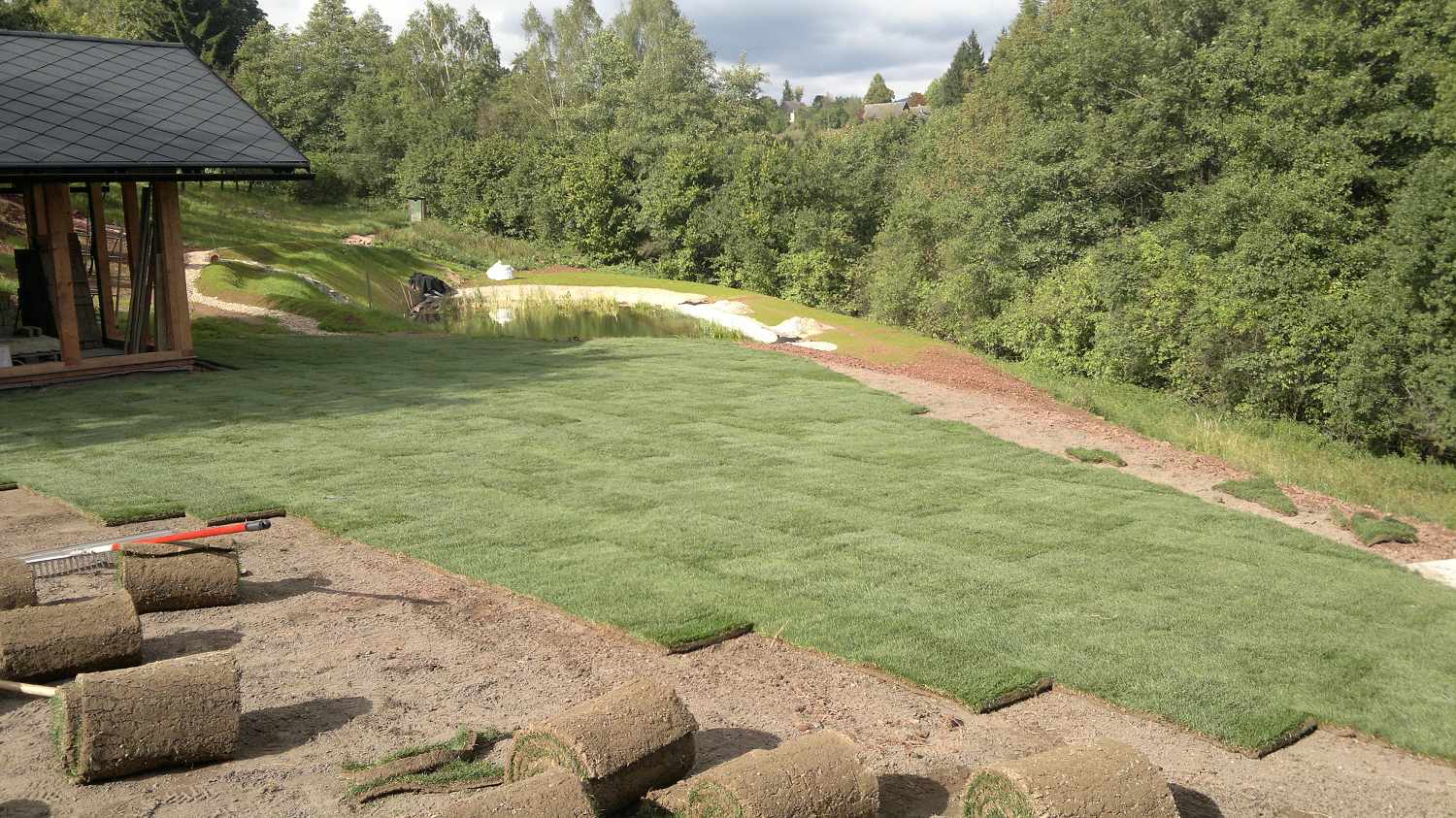 Trávník se pěstuje po dobu 10-12 měsíců a jakmile je dostatečně zakořeněný a kompaktní, odřízne se speciálním strojem (tzv. slupovačkou trávního drnu) i s potřebným kořenovým balem (o tloušťce cca 2cm) a v podobě rolovaného trávníkového koberce se dodává zákazníkovi. Rozměr takto získaného pásu je 40cm šířka a 250cm délka, tj. 1m2. Trávníkové koberce mají použití všude tam, kde je potřeba rychle a kvalitně zatravnit plochu.