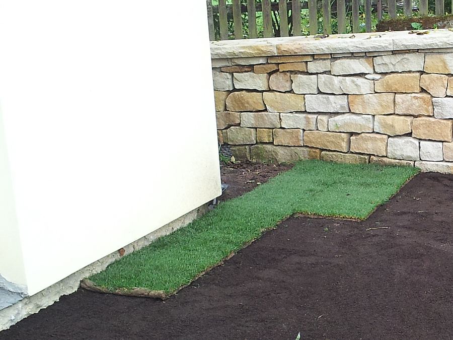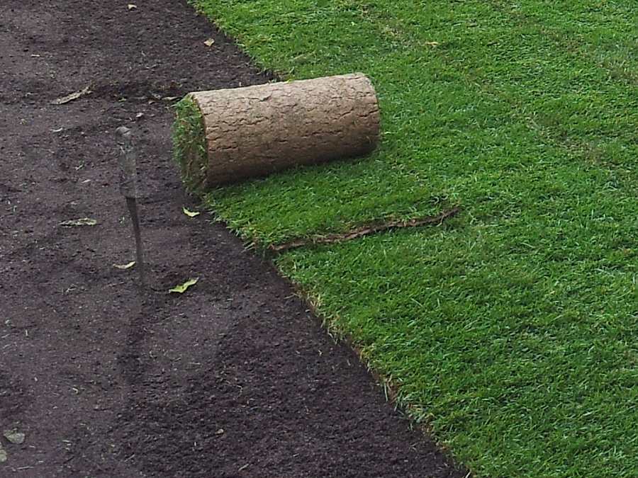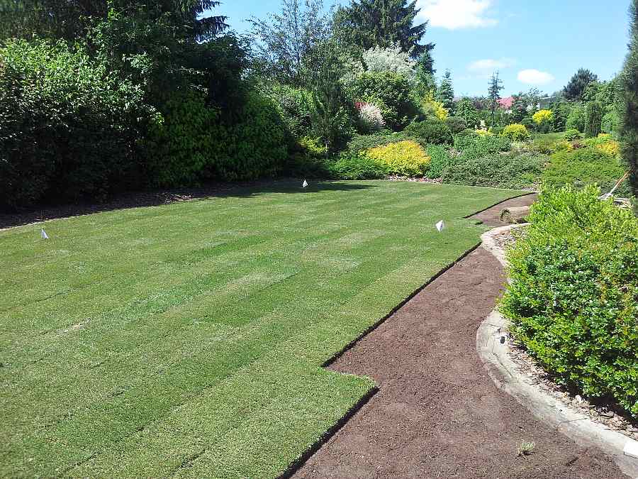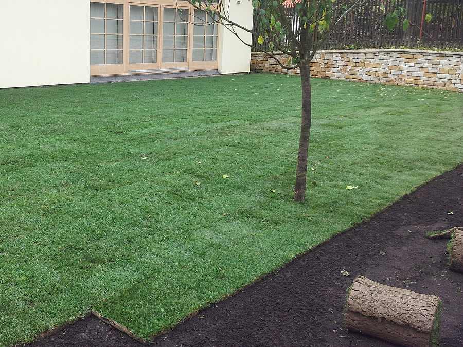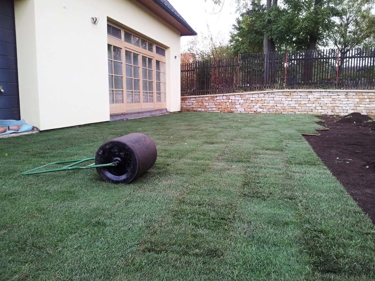 S pokládkou začněte tak, aby byla přístupová cesta pro transport substrátu a rolí za zády k pokládajícím. Pokud to tvar umožňuje, začněte pokládat z větší strany, vždy ale od nejvzdálenějšího konce obrubníku (konce trávníkové plochy). Nejprve si rozmístěte bezplevelný trávníkový substrát a důkladně ho rozložte ve vrstvě 0,5-1 cm. Při „roztahování“ substrátu po trávníku jsme používali sestavu několika opracovaných prken různých délek (od 0,6m do 2 m) ukotvených na vodící tyči, vzájemně a jednoduše vyměnitelných. Nebo trávníkový substrát pod role rozprostřete jednoduše a rychle prostřednictvím rozrovnávacího válce. Substrát po roztažení na vegetační vrstvu nehutněte! Pokládejte ho jen v místech okamžité pokládky, aby ke zbytečnému zhutnění nedošlo chůzí pokládajícími. Role rozkládáme vždy v rovnoběžně s tím, že se příčné spáry nesmějí krýt (vzhledově jako při stavbě cihlové zdi) a konce rolí vždy o 10 cm přeložíme rolí novou. Uprostřed tohoto přeložení nožem přeřízneme obě role a pracovníkovi provádějícímu manipulaci podáme k odvozu již přeřízlou levou horní a pravou spodní část. Potom oba konce ve spojích do sebe kompaktně zapadnou. Povytažením za listy vždy zkontrolujeme, aby konce rolí z příčné, nebo podélné strany nebyly na sobě, nebo nevytvářely oblouk formou vzduchového polštáře. Podélnou část opatrně dlouhým prknem přirážíme k sousední. K tomu opět používáme prkno ukotvené na tyči. Správné položení rolí je jen v celé ploše na substrátu. Jestliže se na pokládané roli objeví defekt, vyřízneme ho a nahradíme jiným kusem tak, aby nebyl menší než 20 cm z každé strany a to z důvodu 100 % ujímatelnosti. Pevné překážky pečlivě obřízněte, konec obrubníků trávníkovým kobercem přeložte a tvar vyřízněte podle jeho hran. Na závěr po pokládce provedeme velmi opatrné válcování válcem o hmotnosti max. 80 kg a to kolmo ke směru pokládky (pro přitlačení koberce k substrátu) a především nezapomeneme položený koberec vydatně zavlažit a to i bez ohledu na případné horké počasí!